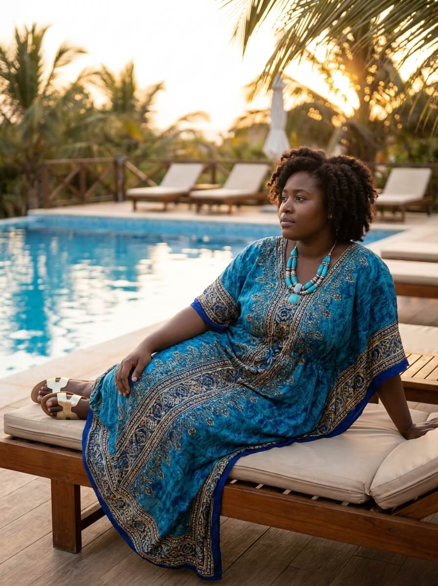 A flowy kaftan dress offers maximum comfort without sacrificing style. Pair it with metallic sandals and a bold necklace for a relaxed yet elevated look—perfect for poolside lounging or casual evening gatherings.