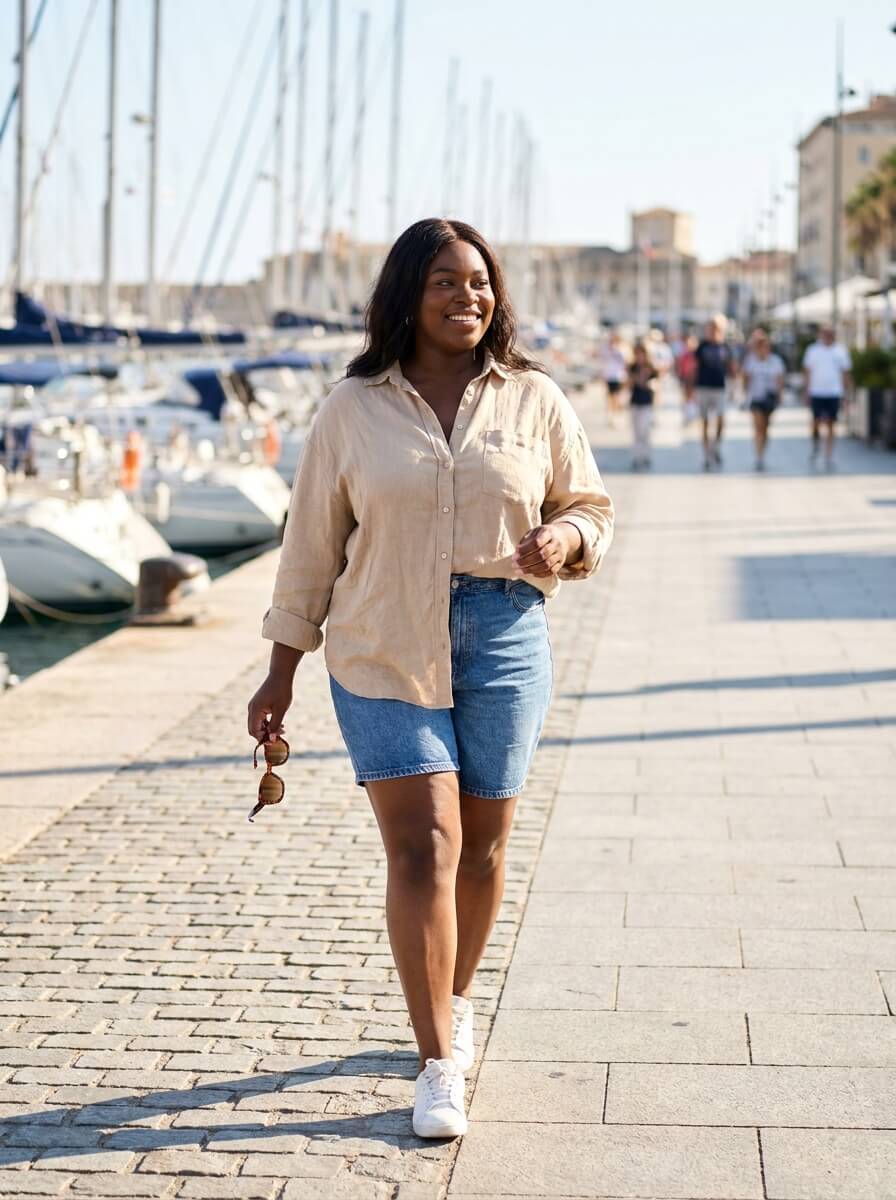 A slightly oversized linen button-down keeps things airy while offering coverage. Tuck it loosely into denim shorts and pair with white sneakers for a fresh, casual summer cruise outfit that’s practical for excursions.
