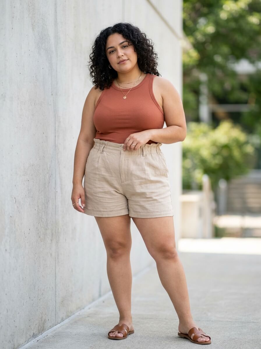 A fitted tank tucked into paperbag waist shorts highlights your waist while keeping things relaxed. Add neutral slides and delicate jewelry for a clean, effortless summer cruise outfit that’s both flattering and breathable.