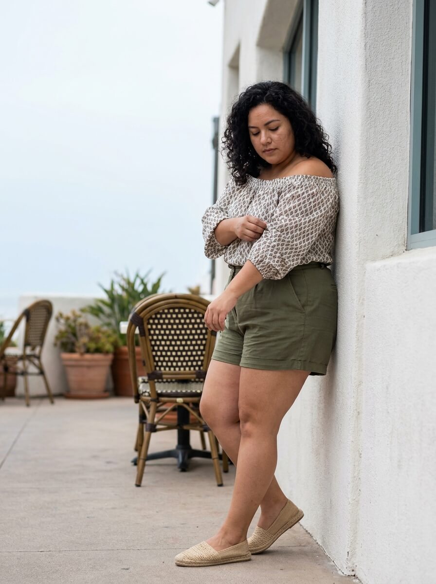2. Off-Shoulder Top + High-Waisted Shorts + Espadrilles