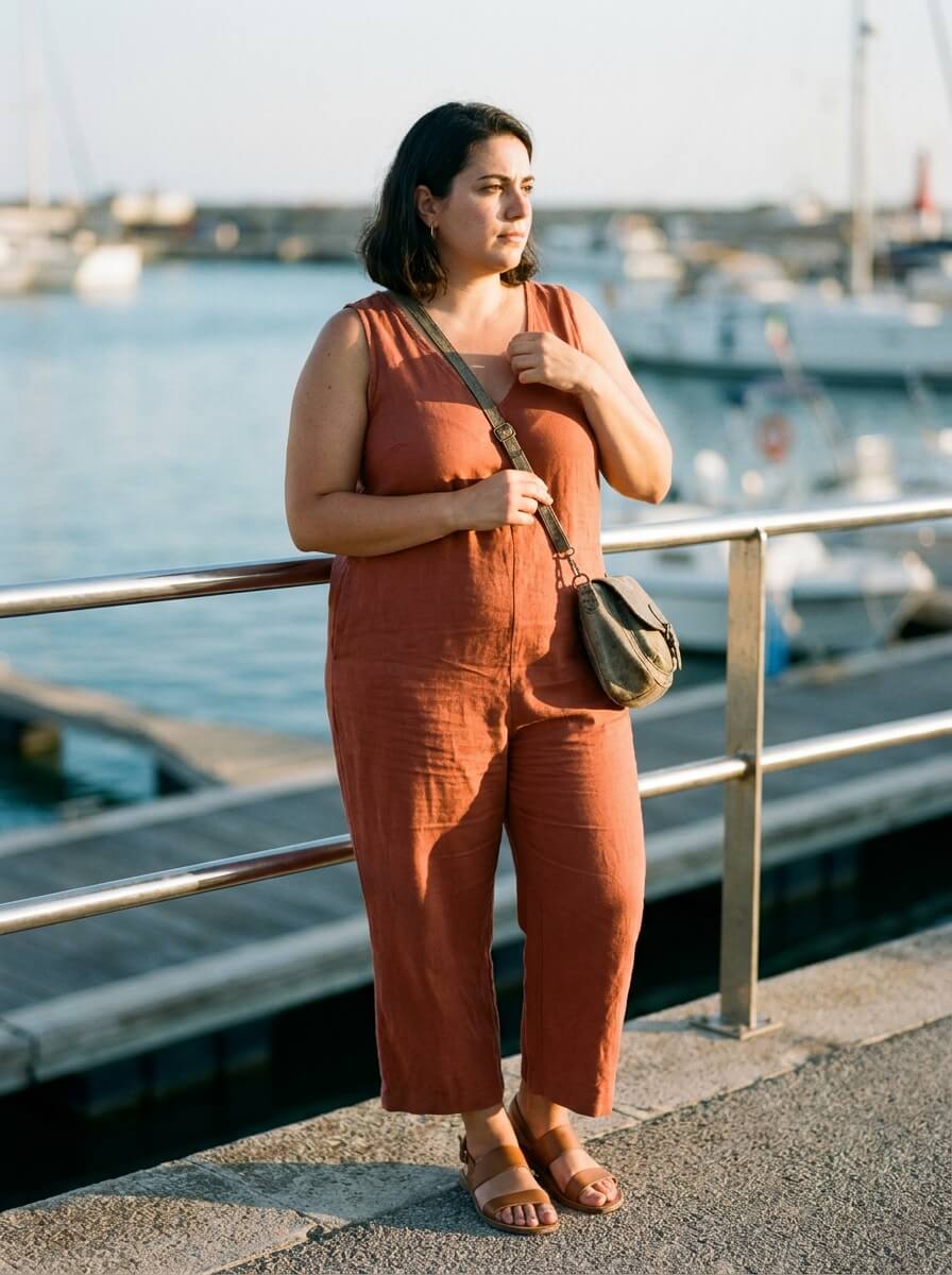 A lightweight sleeveless jumpsuit eliminates outfit stress while offering a clean, elongated silhouette. Add flat sandals and a crossbody bag for a comfortable, all-day look that works for sightseeing and onboard activities.