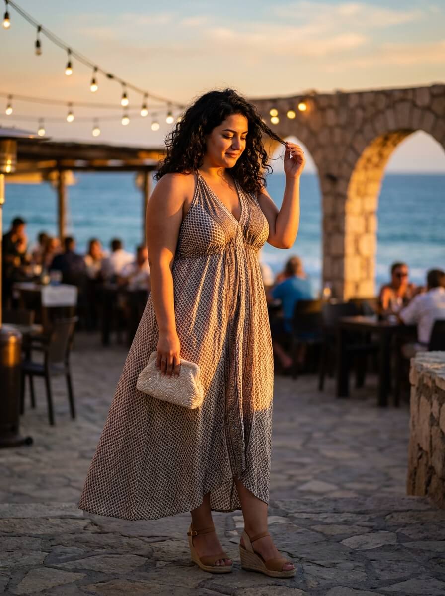 A halter neck dress draws attention upward while offering a breezy silhouette. Paired with wedges and a simple clutch, this look works beautifully for evening dinners or cruise events without feeling overly formal.