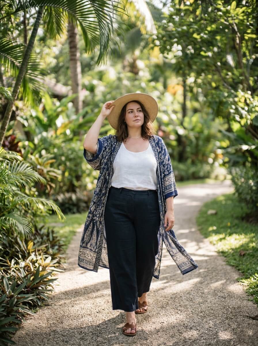 Layering a printed kimono over a breathable tank and flowy wide-leg pants adds movement and dimension. Finish with flat slides and a straw hat for a chic, relaxed cruise outfit idea that feels effortless yet styled.