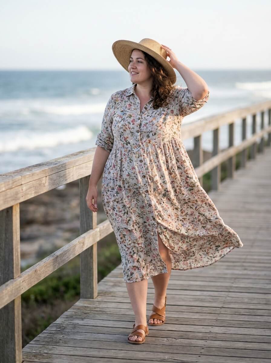 A button-front dress adds structure while allowing adjustable comfort. Styled with flat sandals and a wide straw hat, this outfit is ideal for sunny deck days and gives a timeless, vacation-ready aesthetic.