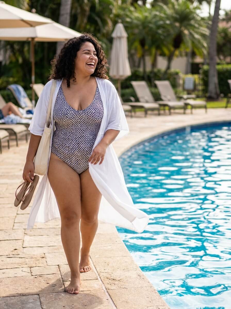 A well-fitted swimsuit layered with a sheer, flowy cover-up creates a stylish poolside look. Add flip flops and a roomy tote for a practical yet polished outfit that transitions easily from pool to lunch.