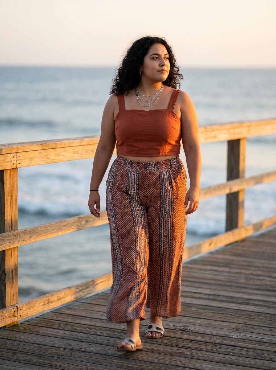 A modest crop top paired with high-waisted palazzo pants balances proportions beautifully. This combination creates a breezy, flattering silhouette—ideal for warm evenings on deck with simple slides and layered necklaces.