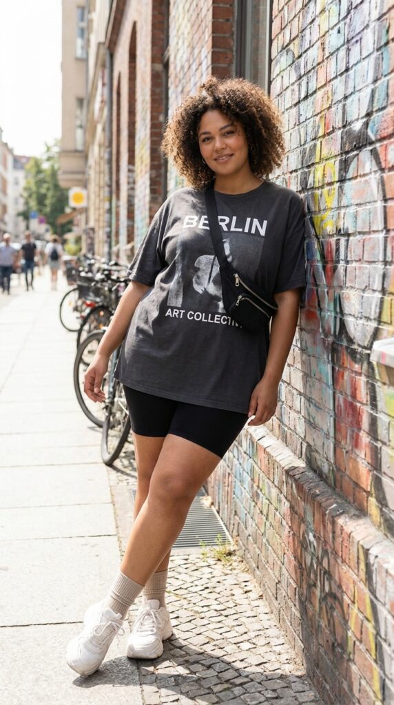An oversized graphic tee styled with stretchy biker shorts is a go-to for travel days. Finish with chunky sneakers, crew socks, and a belt bag for a sporty, street-style inspired outfit.