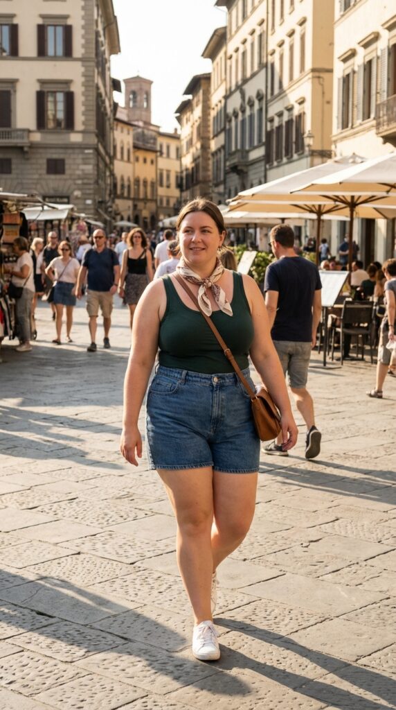 A fitted tank tucked into high-waisted shorts creates a flattering silhouette. Add comfy sneakers, a lightweight scarf, and a crossbody bag—perfect for warm days and busy walking tours.