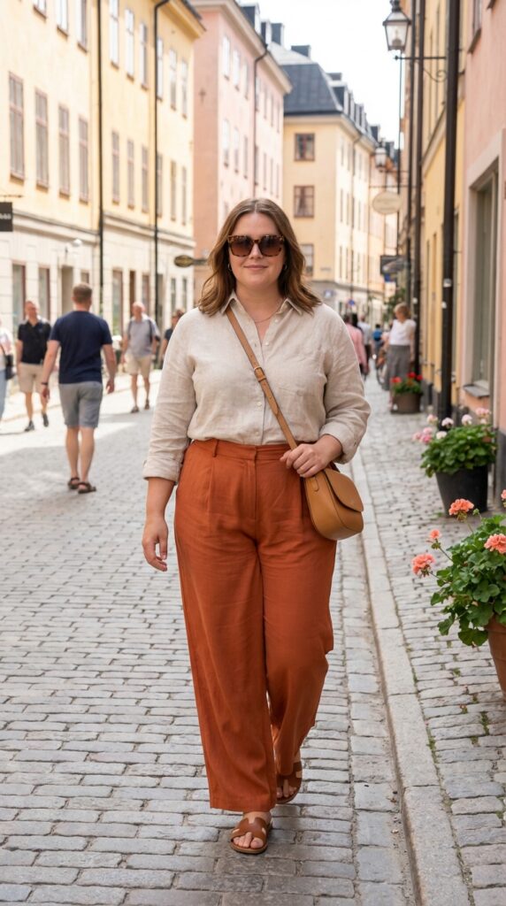A lightweight linen button-down paired with flowy wide-leg pants creates a breathable and polished look. Add leather sandals, oversized sunglasses, and a crossbody bag for a relaxed yet elevated vibe—perfect for warm European afternoons.