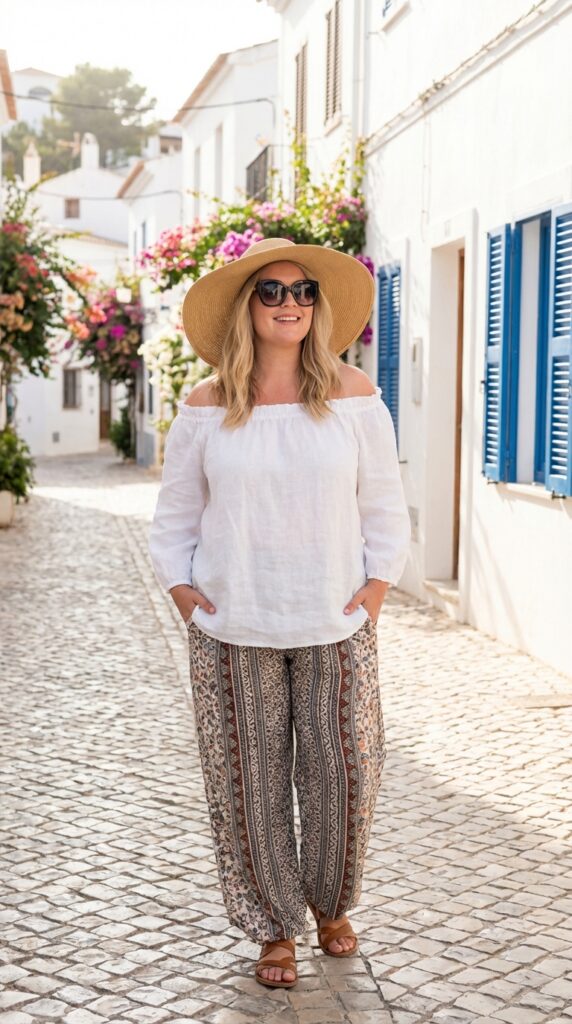 An off-shoulder blouse paired with palazzo pants gives a breezy, feminine feel. Add flat sandals, a wide-brim hat, and oversized sunglasses for a relaxed vacation-ready outfit.