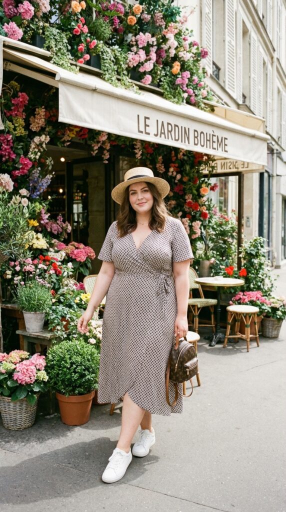 A flattering wrap midi dress defines your waist while staying airy and comfortable. Pair it with classic white sneakers, a straw hat, and a mini backpack for effortless exploring—ideal for comfy plus size vacation looks.