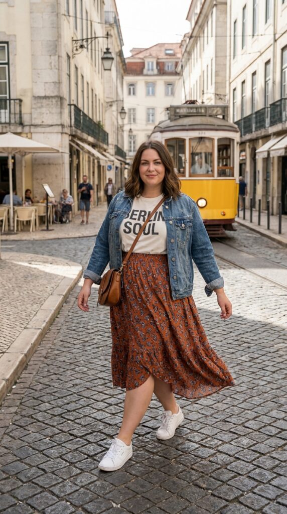 Mix casual and chic with a tucked-in graphic tee and a flowy midi skirt. Style with sneakers, a denim jacket, and a crossbody bag for an easy outfit that fits right into plus size Europe outfits trends.