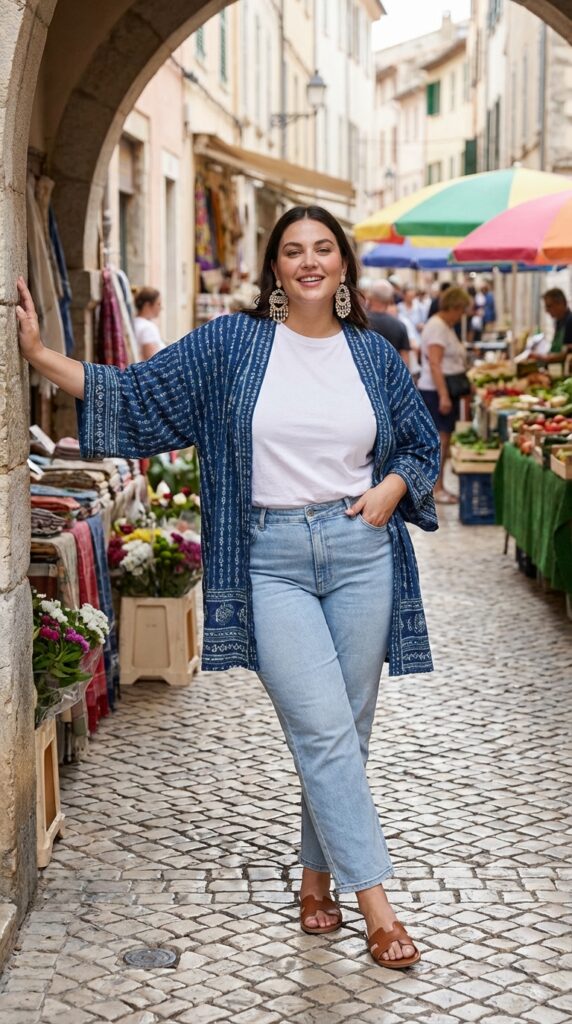Layer a printed kimono over a basic tee and straight-leg jeans for a relaxed yet stylish look. Finish with sandals and statement earrings for a touch of personality in your curvy travel outfits.