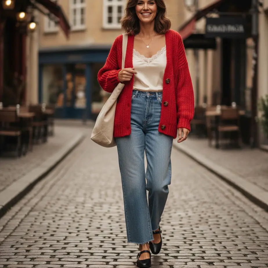 Style your red knit cardigan over a lace-trim camisole and wide-leg jeans. Add Mary Janes and a tote bag — soft, stylish, and social-media approved.