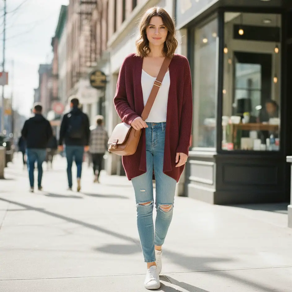 Go subtle with a maroon cardigan outfit over a white cami and ripped jeans. Add sneakers and a crossbody bag for effortless off-duty comfort.