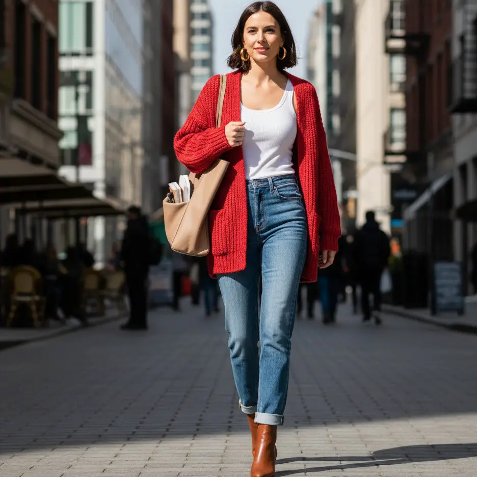 Pair your red knit cardigan with a white tank, high-waisted blue jeans, and ankle boots. Add gold hoops and a tote bag for a casual yet elevated everyday look.