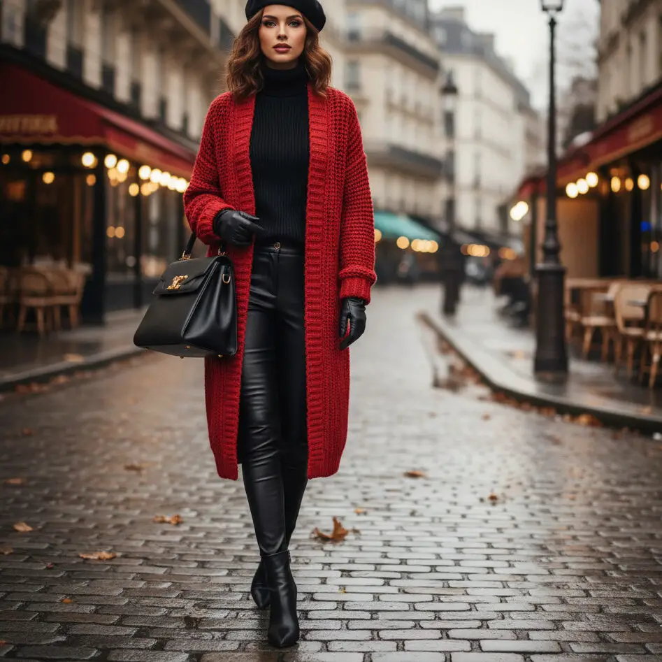 Wear a longline red cardigan outfit with a black turtleneck, leather leggings, and heeled boots. Add a wool beret and gloves for that Parisian winter aesthetic.