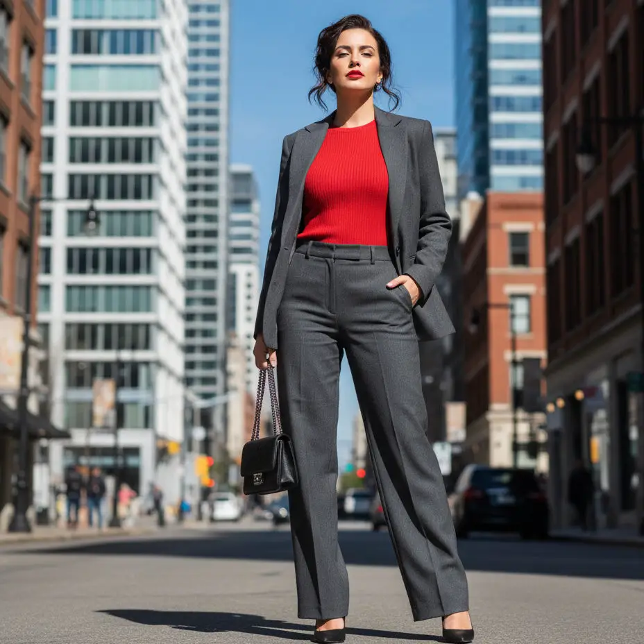 Tuck a red top outfit under your cardigan with high-rise trousers and heels. Add a blazer for a color-blocked, confident statement look.
