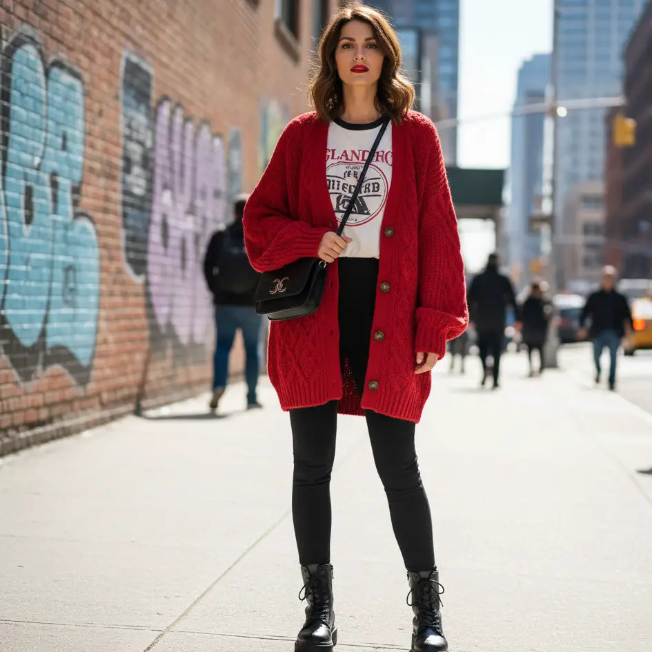 Combine a chunky red cardigan outfit with black leggings, a graphic tee, and combat boots. Add a crossbody bag for that edgy streetwear twist.