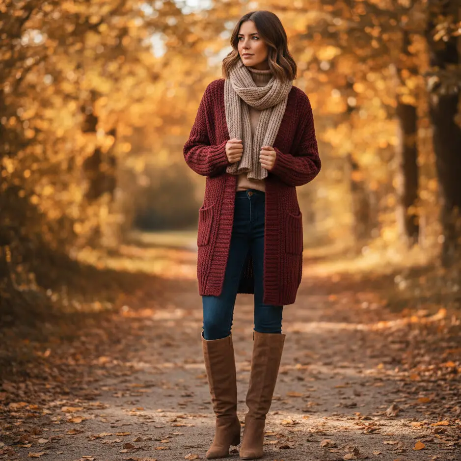 A burgundy cardigan outfit pairs beautifully with a beige turtleneck, skinny jeans, and suede boots. Add a neutral scarf for cozy autumn layering perfection.