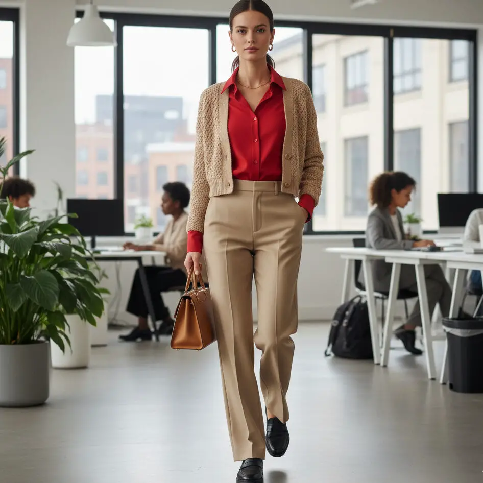 Pair your red shirt outfit with tailored beige pants and a cropped cardigan. Add loafers and a structured handbag for chic smart-casual workwear.