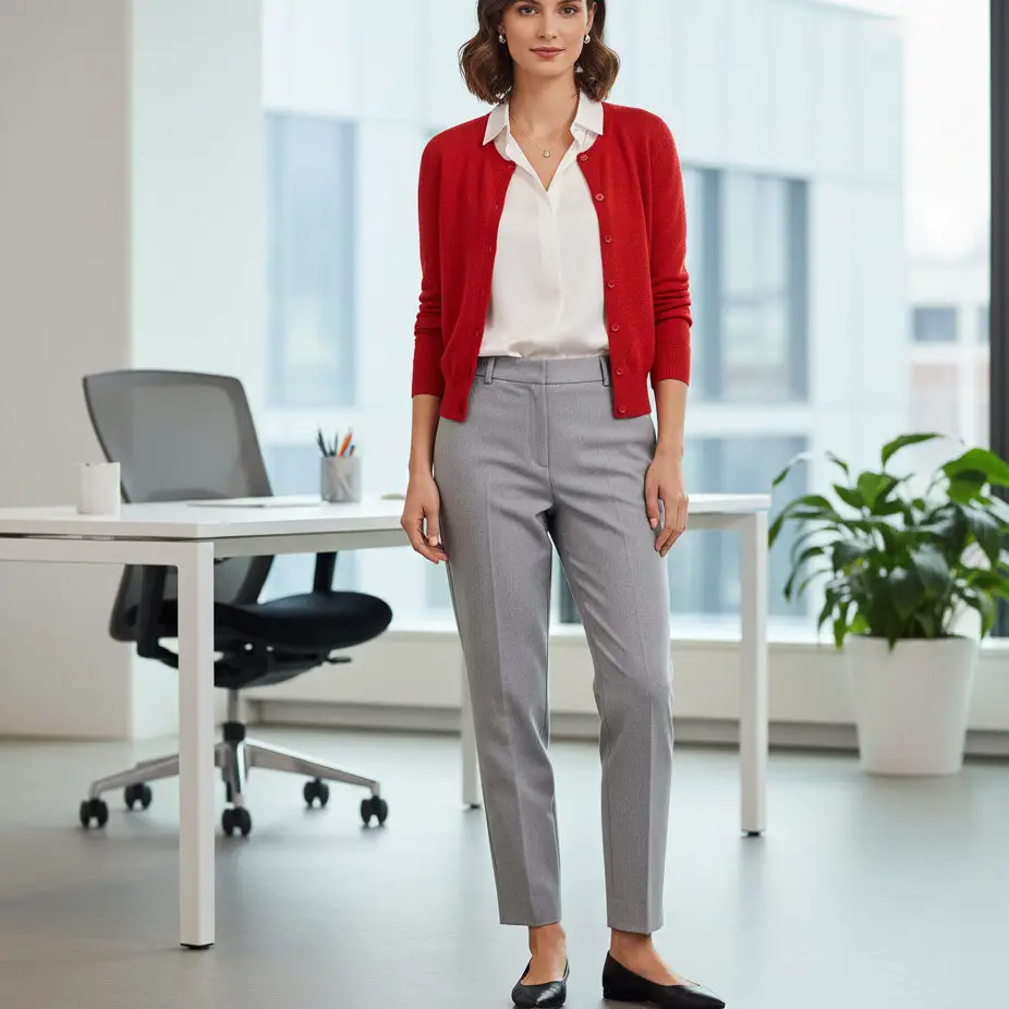 Style your red knit cardigan with a white blouse, grey trousers, and pointed flats. Add minimal jewelry for a sleek office outfit that stands out yet stays professional.