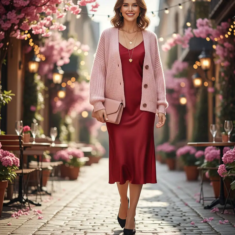 A pink cardigan outfit layered over a red dress or cami creates the ultimate Valentine-inspired palette. Add gold jewelry and kitten heels for playful, girly charm.