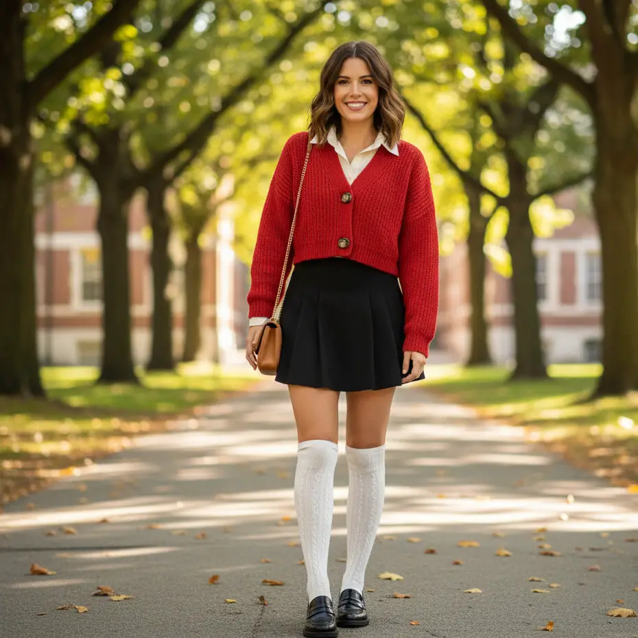 Channel your dream clothes energy with a soft red cropped cardigan, a pleated mini skirt, and loafers. Add knee socks and a shoulder bag for a preppy, Pinterest-inspired look.