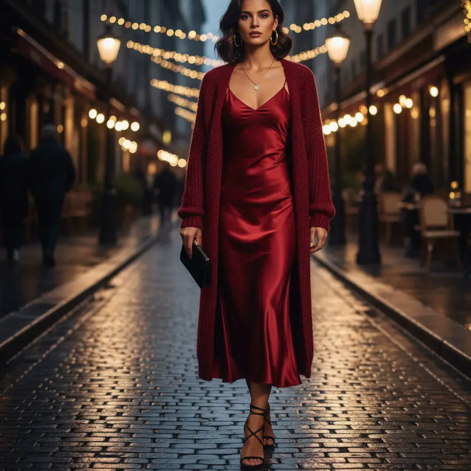 A burgundy cardigan outfit over a satin slip dress and strappy heels creates understated glamour. Add hoop earrings and a clutch for evening elegance that turns heads.