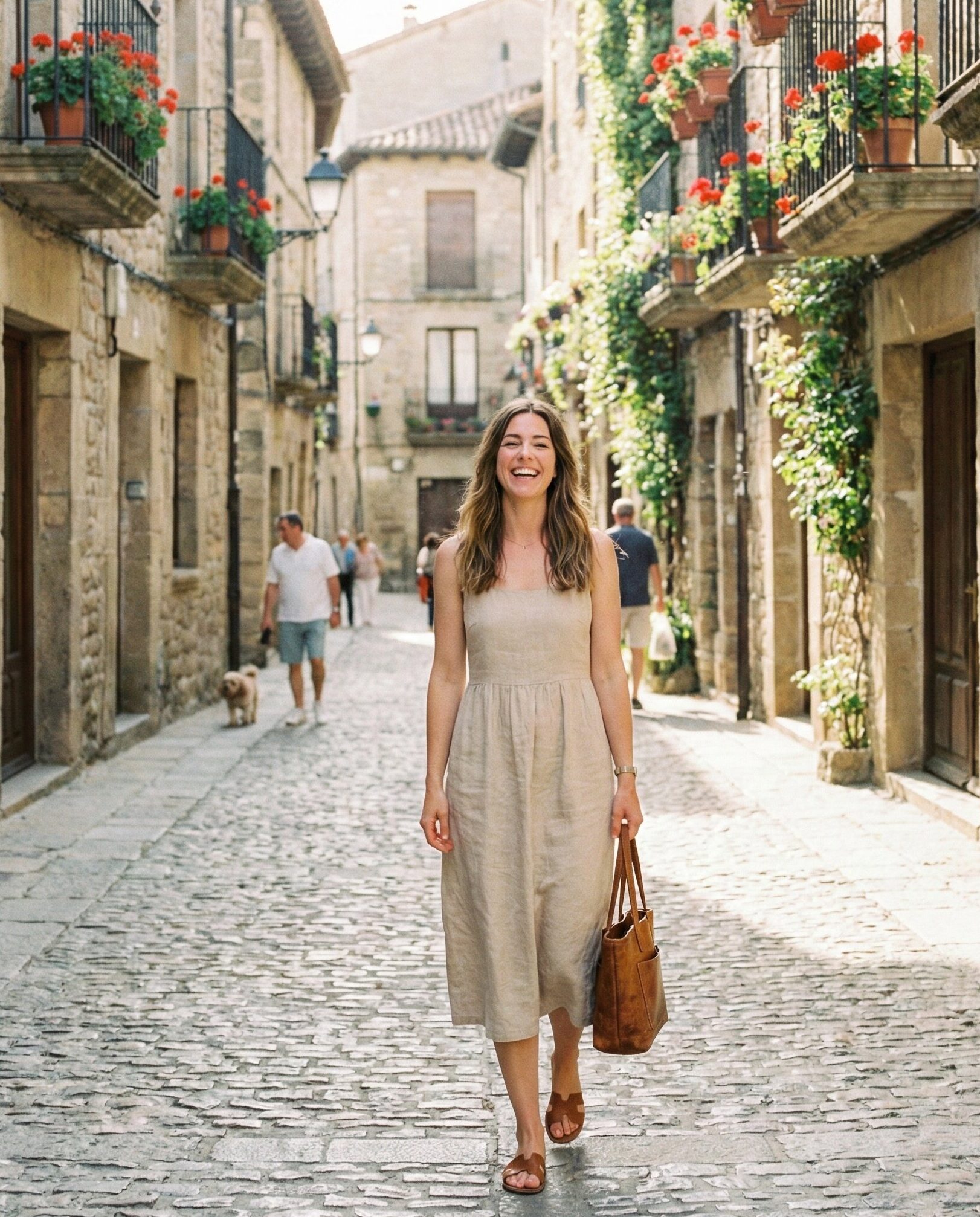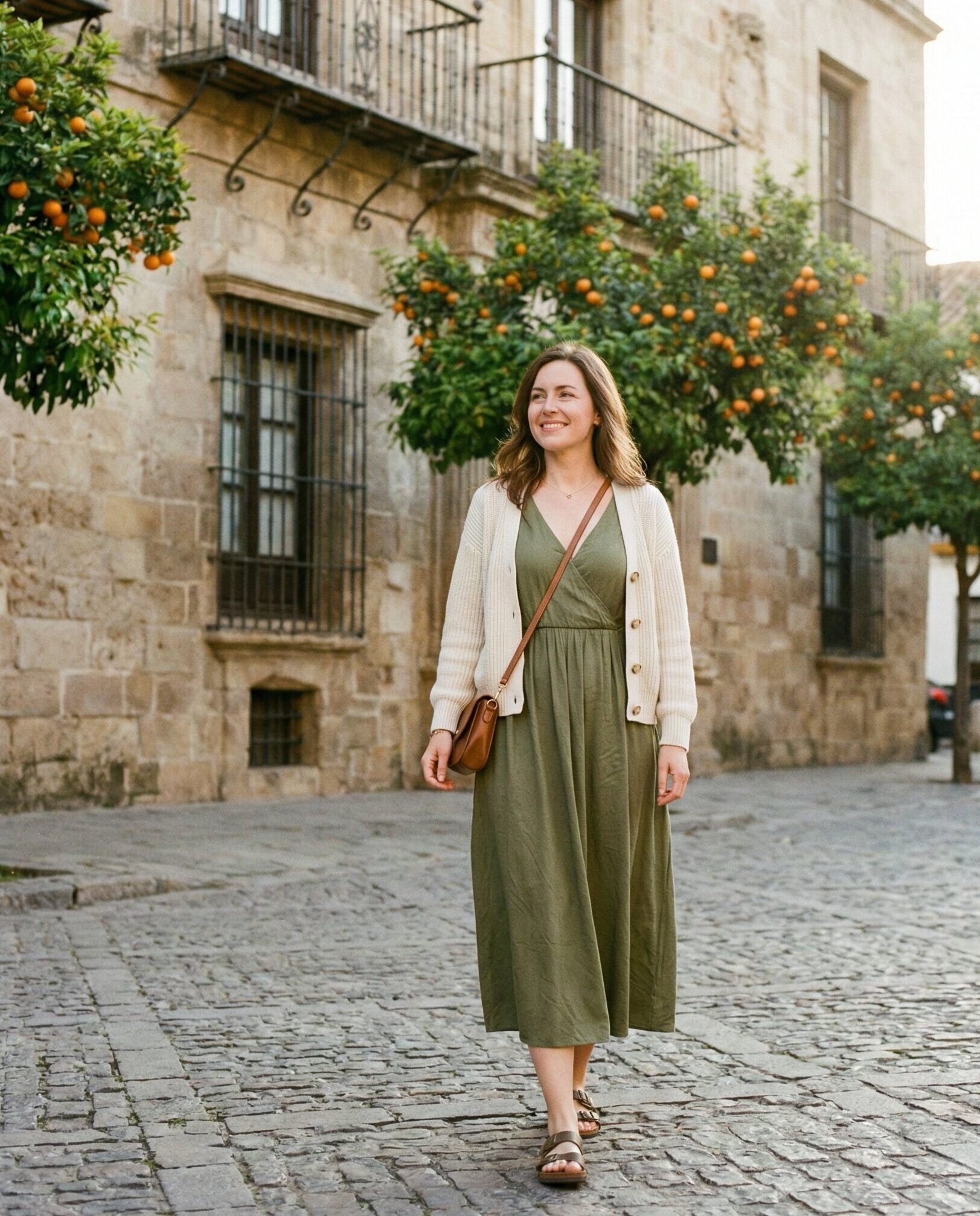 A linen midi dress is ideal for Spain’s warm spring days. The breathable fabric keeps you cool while the length adds elegance for city exploring. Flat sandals provide comfort for walking, making this outfit perfect for historic streets, cafés, and relaxed sightseeing.