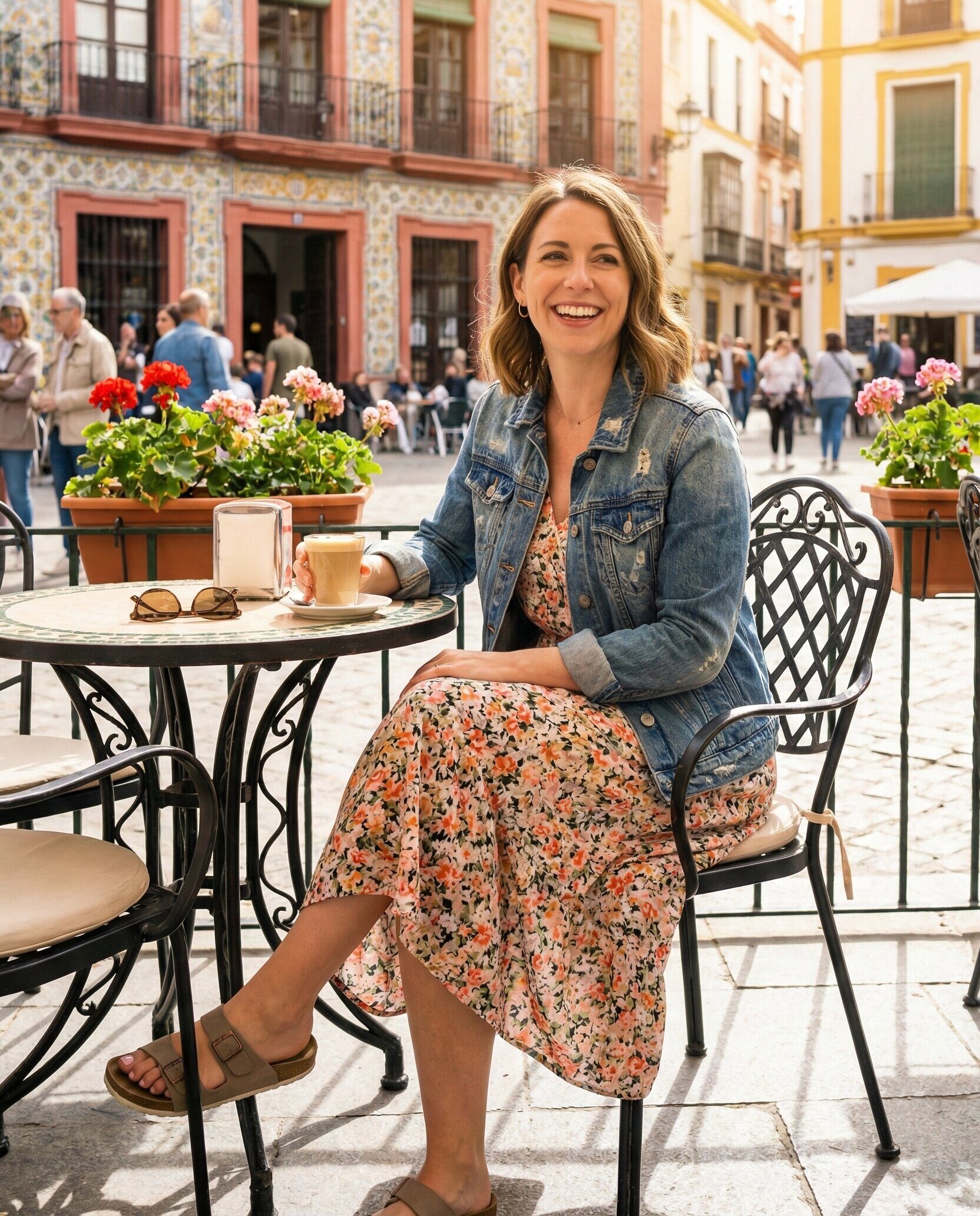 A floral dress captures the lively Spanish spring vibe. Adding a denim jacket provides warmth during cooler moments. This outfit feels feminine yet practical, ideal for outdoor cafés, sightseeing, and casual cultural outings.