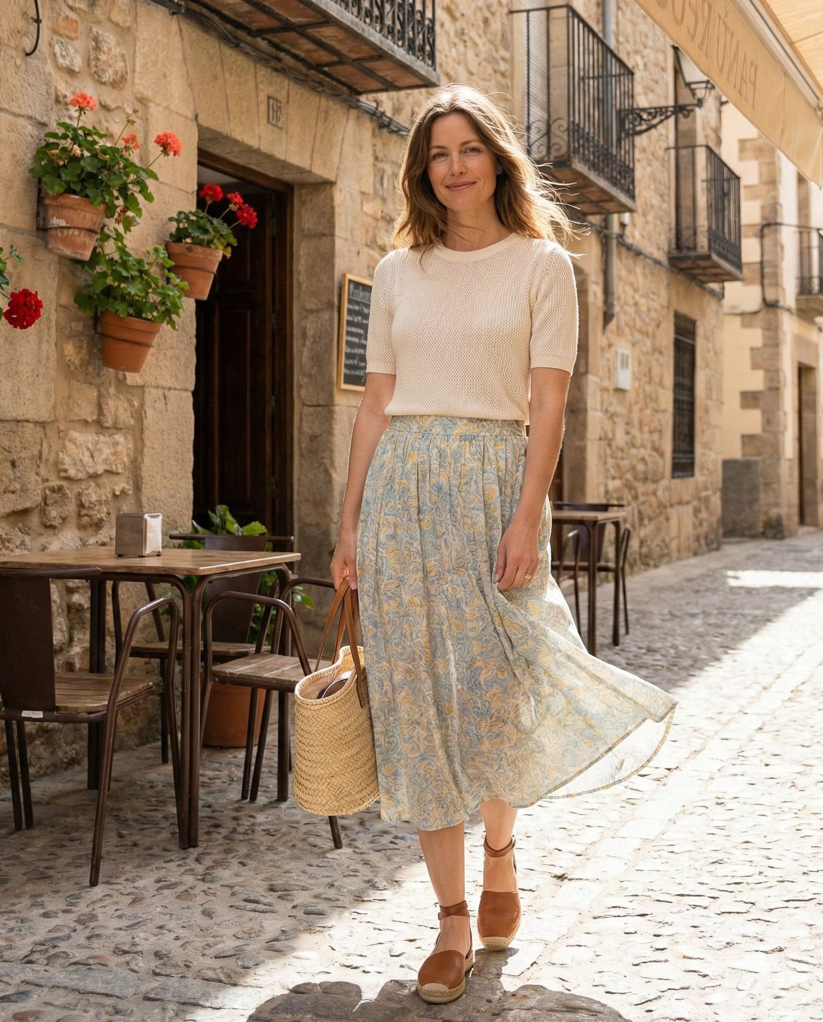 A soft knit top adds comfort while a midi skirt brings elegance and flow. This combination works well for cooler mornings and warmer afternoons, making it a versatile outfit for sightseeing, lunches, and relaxed evening strolls.