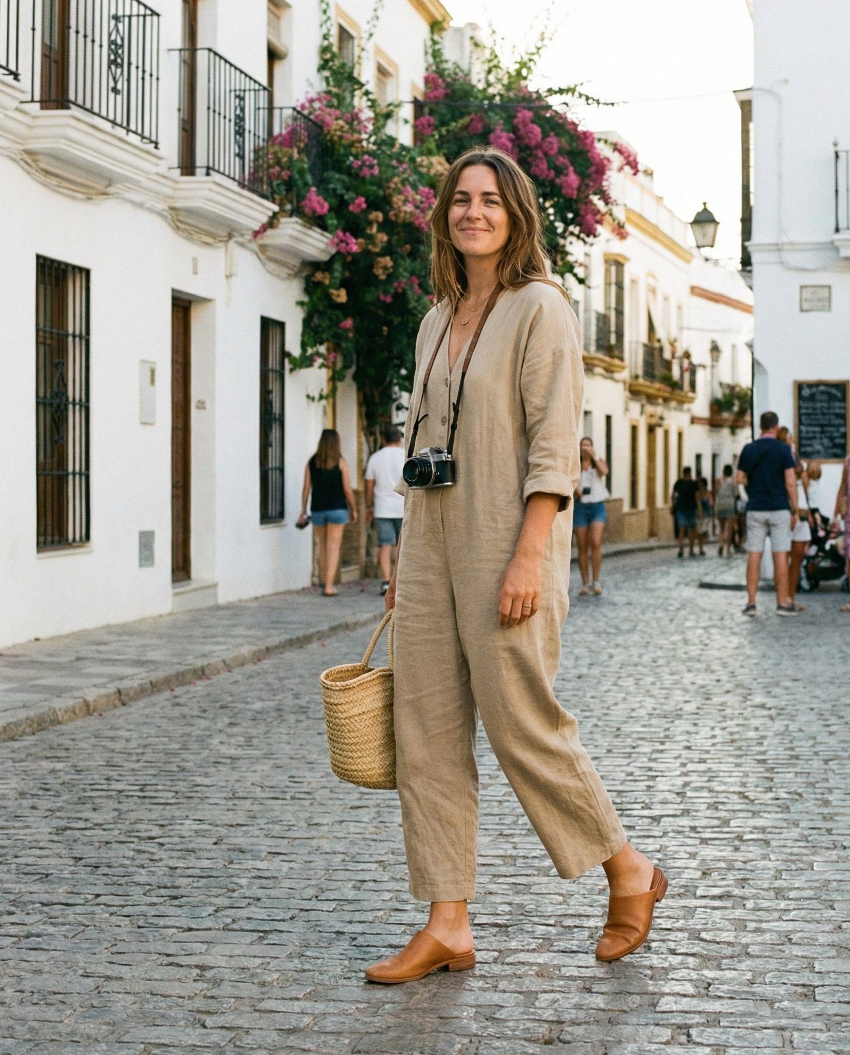 A neutral co-ord set looks put together without effort. Matching pieces simplify styling while remaining breathable and comfortable. Paired with sandals, this outfit is perfect for relaxed sightseeing and travel photos around Spain.