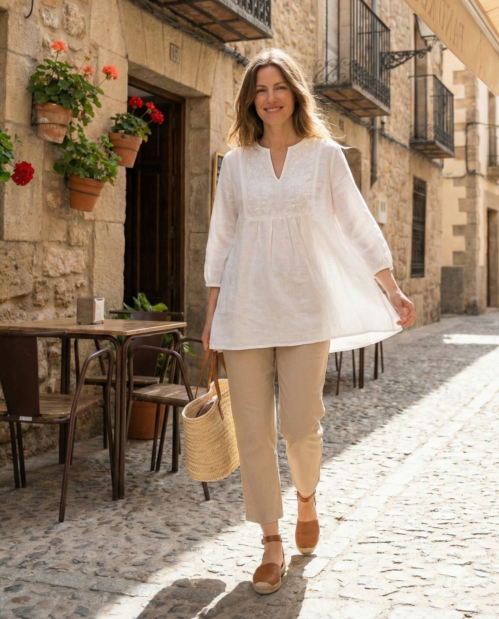 A sleeveless blouse keeps things light and airy, while linen trousers provide comfort and polish. This outfit works well for warm spring afternoons and feels effortlessly stylish for exploring markets, museums, or coastal towns.