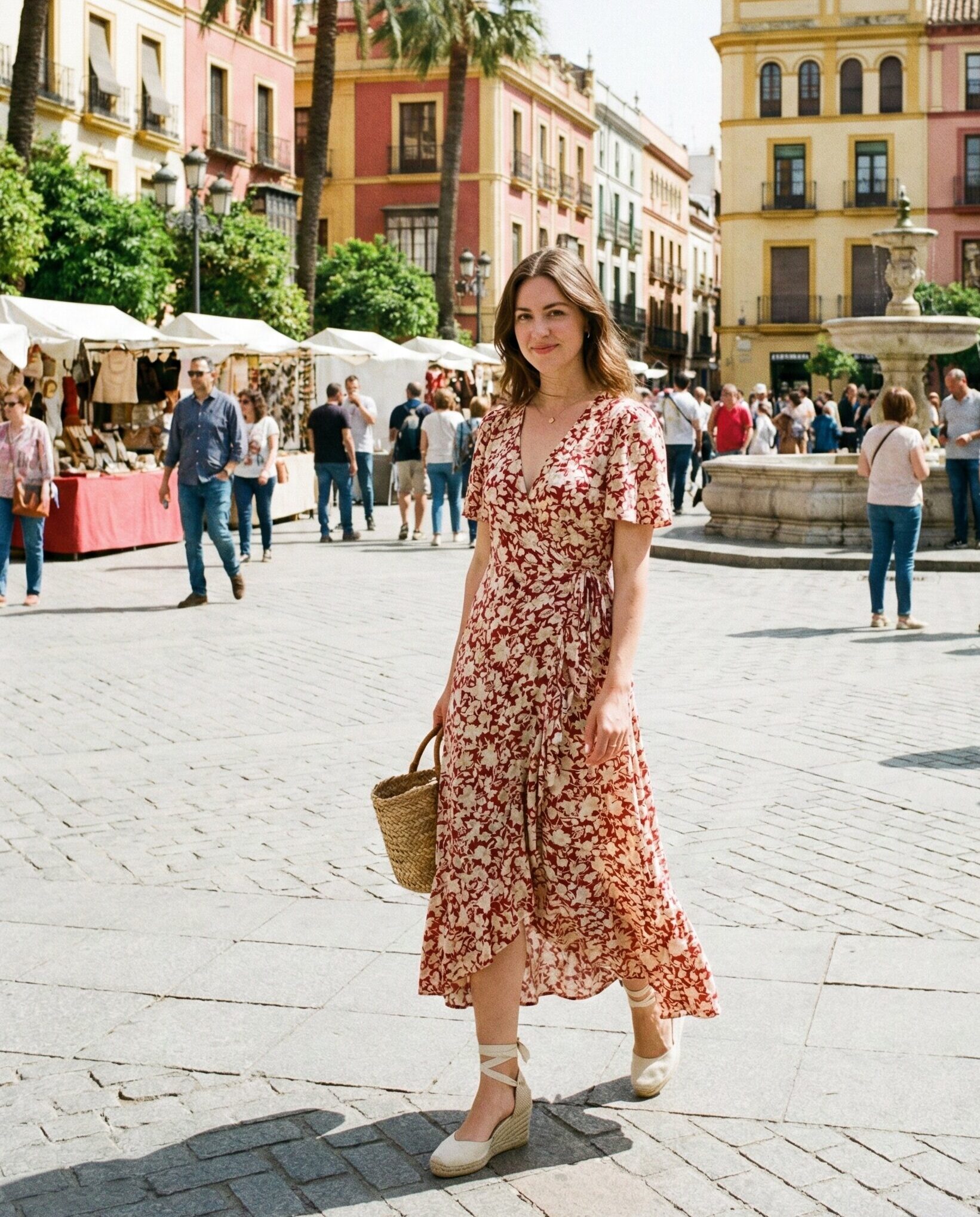 A flowy wrap dress flatters the figure while allowing easy movement. Espadrilles add a classic Spanish touch and are comfortable for walking. This outfit transitions beautifully from daytime sightseeing to evening dinners in lively Spanish plazas.