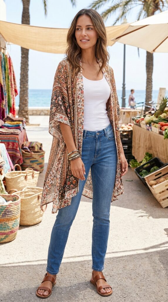 Layer a printed kimono over a basic tank and slim-fit jeans. Add sandals and stacked bracelets. This relaxed look fits perfectly into laid-back cruise fashion ideas while still feeling stylish.