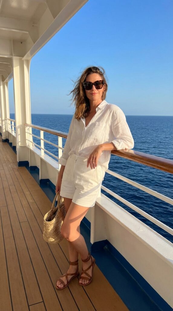 A lightweight linen button-down paired with crisp white shorts is perfect for daytime exploring. Add strappy sandals, oversized sunglasses, and a woven tote. This look keeps you cool while matching effortless cruise outfits for women vibes.