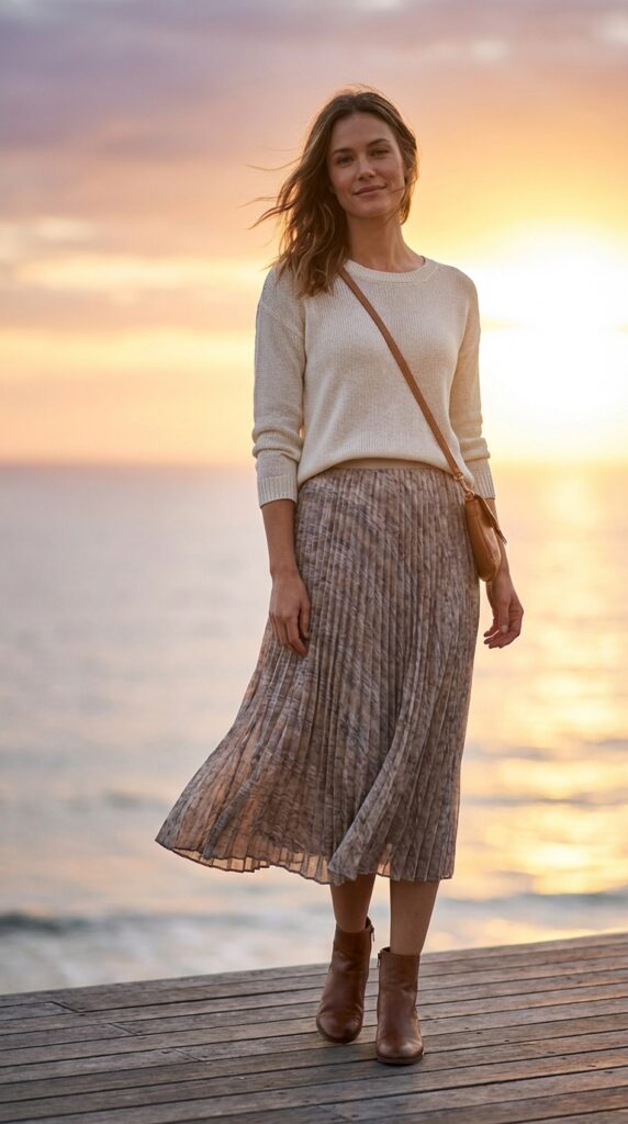 For breezy evenings, style a lightweight sweater with a flowy midi skirt. Add ankle boots or flats and a crossbody bag. This outfit keeps you warm without compromising elegance.