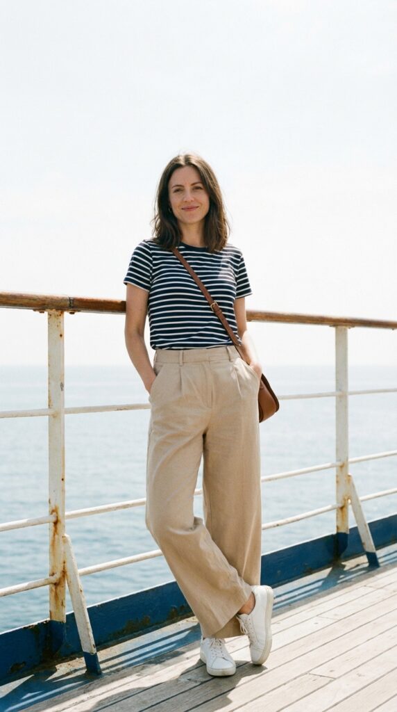 Classic nautical stripes never fail on a cruise. Style a striped tee with wide-leg trousers, white sneakers, and a crossbody bag. This outfit blends comfort and timeless cruise fashion ideas perfectly.