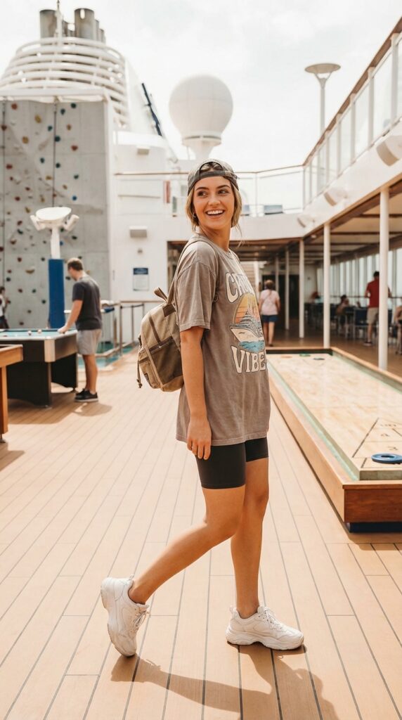 For a sporty vibe, pair an oversized graphic tee with biker shorts. Complete the look with sneakers, a cap, and a backpack. It’s perfect for excursions or active cruise days.