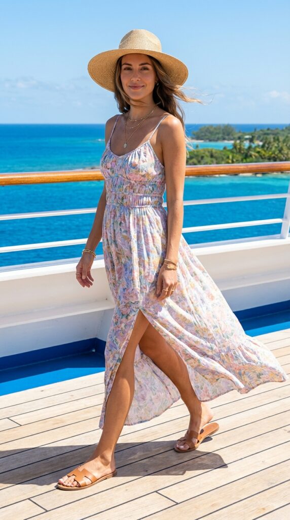 A flowy floral maxi dress captures the essence of summer cruise outfits. Pair it with flat sandals, delicate jewelry, and a straw hat. It’s ideal for strolling the deck or casual dinners while looking feminine and relaxed.