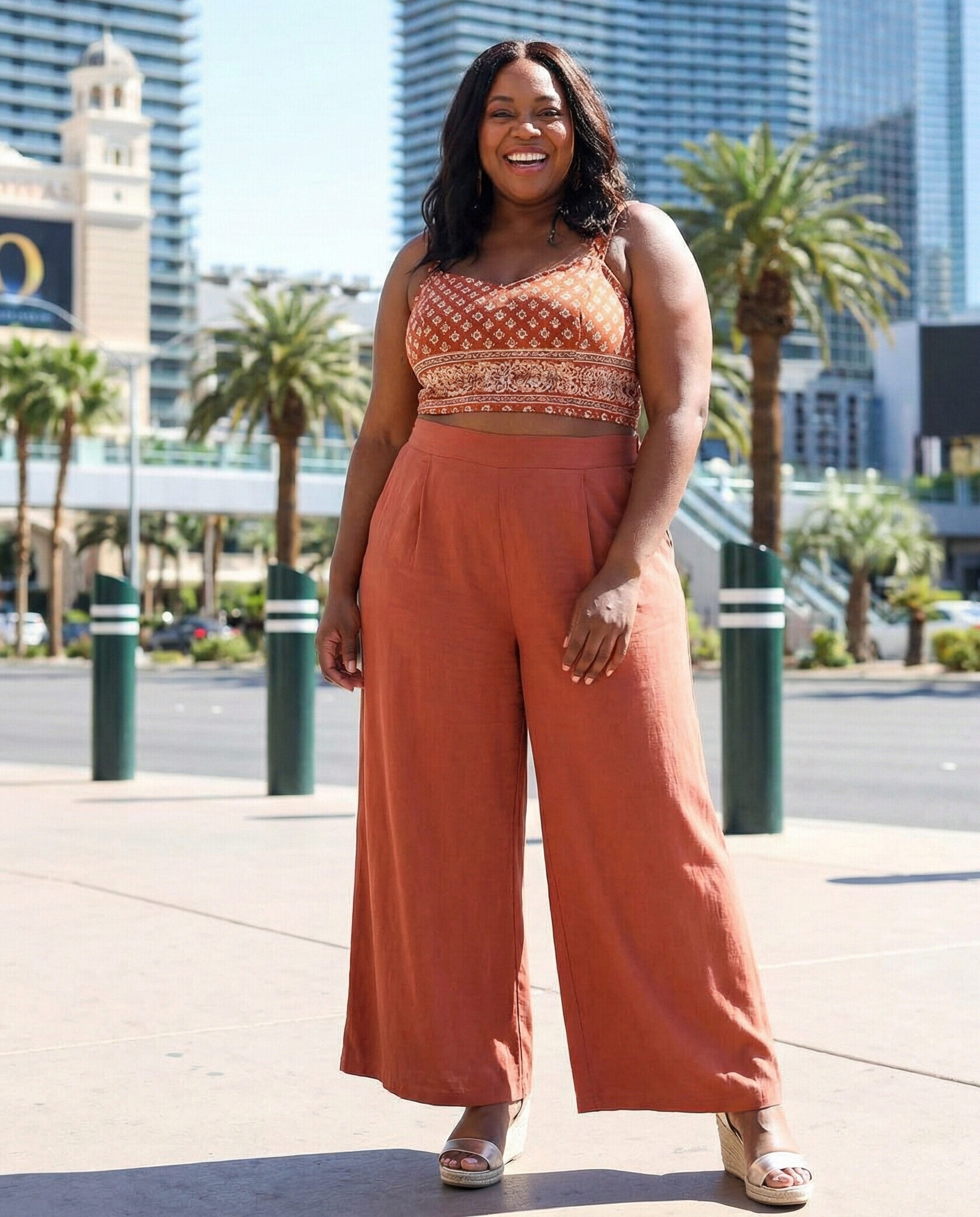 A crop top with palazzo pants balances proportions beautifully. High-waisted pants provide comfort and coverage, while the crop top adds Vegas flair. Finish with wedges or heels for height.