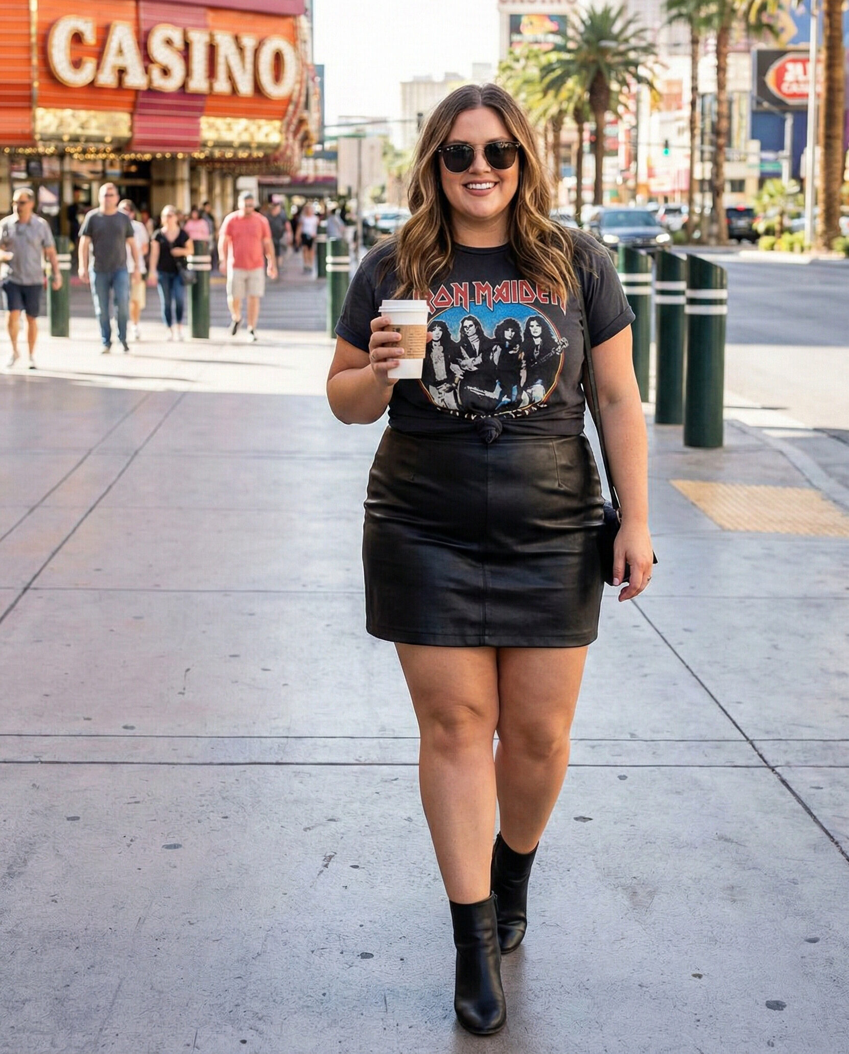 A leather skirt paired with a graphic tee creates a cool, edgy Vegas look. Tuck the tee slightly to define the waist, and finish with ankle boots or heels for a stylish contrast.