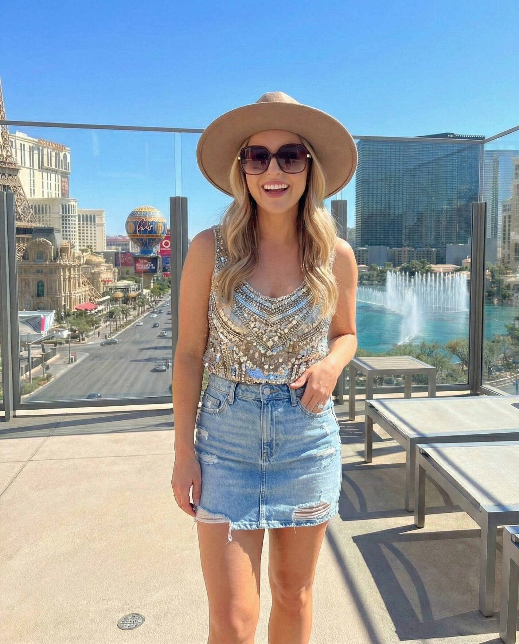 A denim skirt styled with a glam or embellished top creates a casual-meets-glam look. This outfit works well for relaxed Vegas nights or bar hopping. Add heels to elevate the overall appearance.