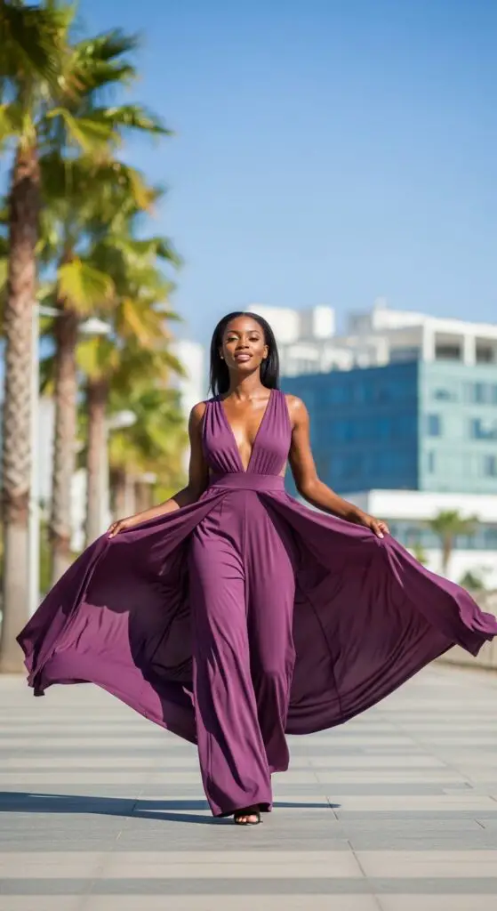 A plunging wide-leg jumpsuit elongates the frame and adds effortless glamour. Choose deep tones like plum or navy for an elegant finish.