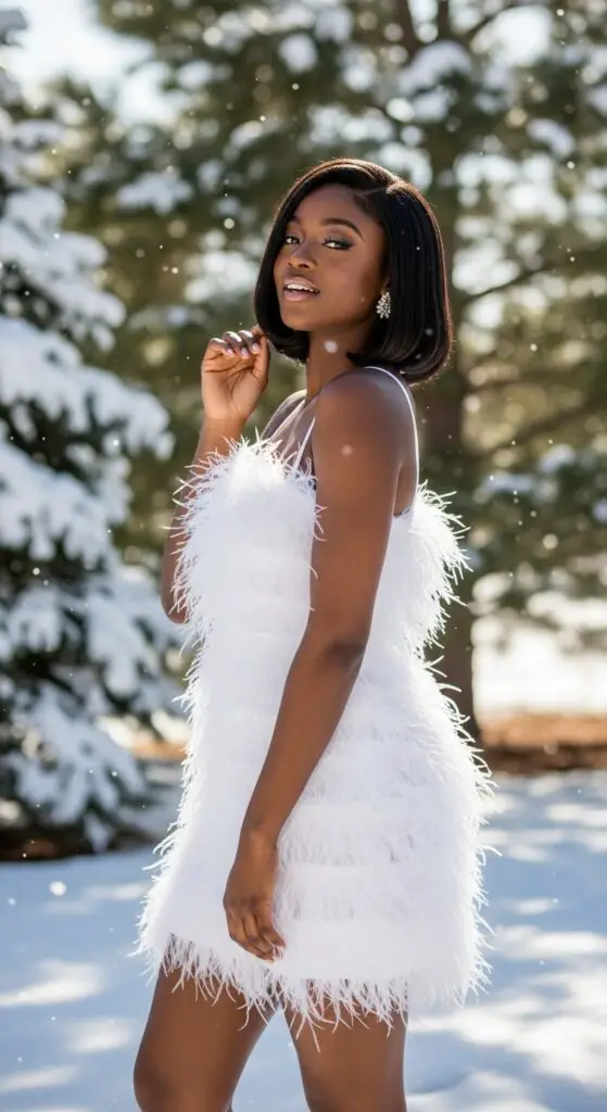 A white mini dress with feather trim gives a playful, chic vibe. The bright tone pops beautifully on deeper complexions for holiday nights out.