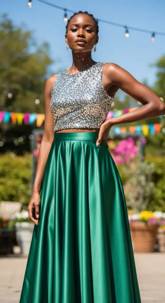A high-waist satin skirt paired with a sequin or glitter top creates a balanced, festive outfit that shines without overwhelming the silhouette.