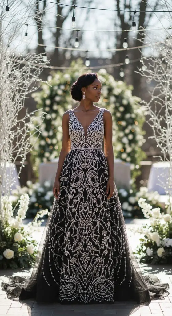 A black gown with crystal embellishments feels timeless yet festive. It’s ideal for formal Christmas parties where you want a sophisticated look.