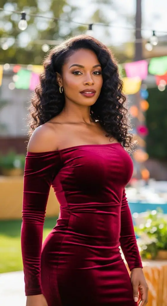 Velvet hugs curves beautifully, and an off-the-shoulder neckline adds glam detail. Choose rich tones like wine or deep green for maximum glow.