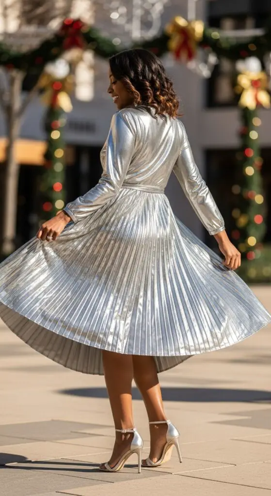 A pleated metallic midi dress offers movement, shine, and elegance. It’s a party-perfect option that’s flattering and eye-catching.